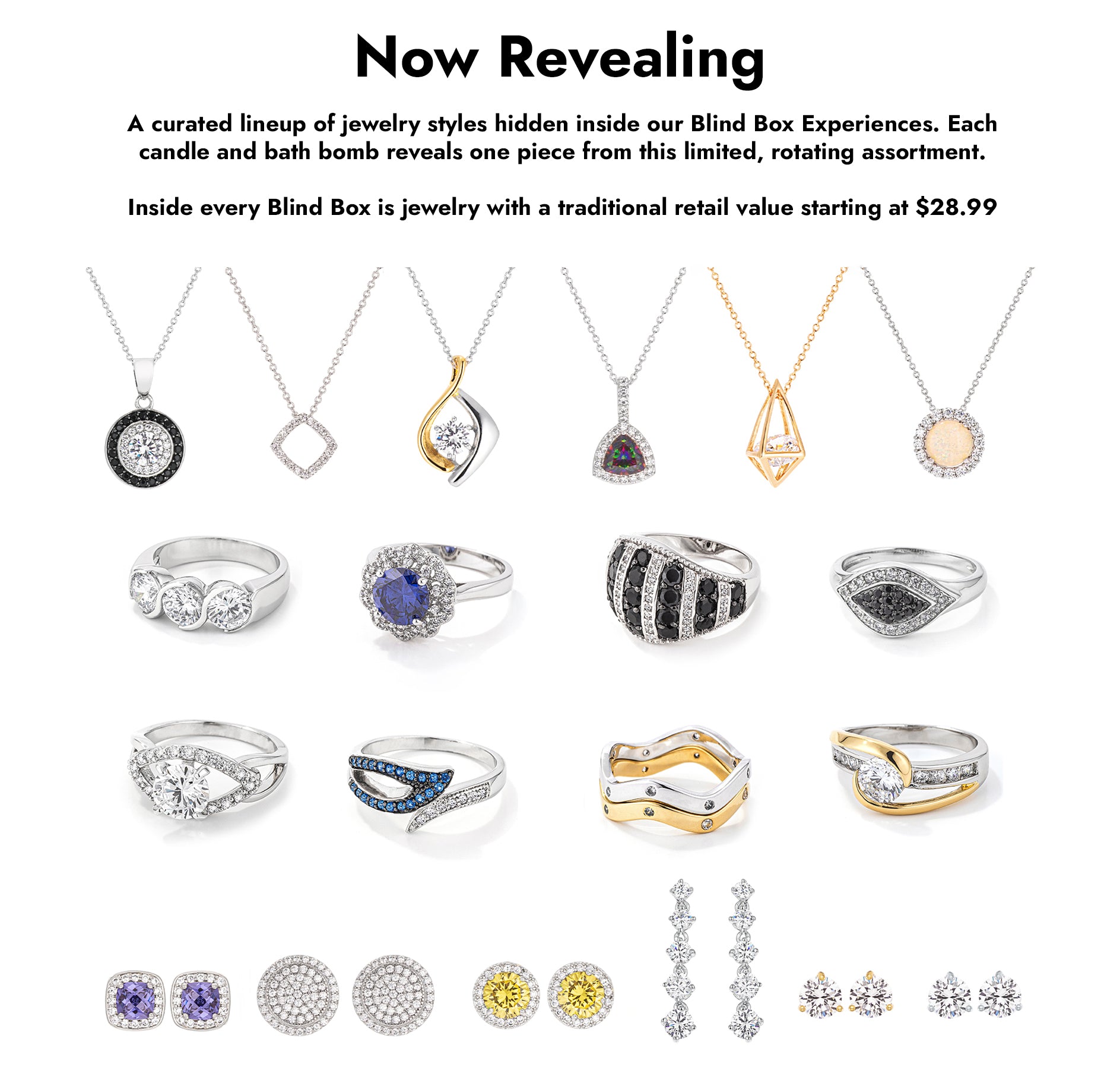 •Blind Box jewelry begins at a higher traditional retail value than our standard JewelScent collections. Each experience reveals one piece from a limited assortment of styles.